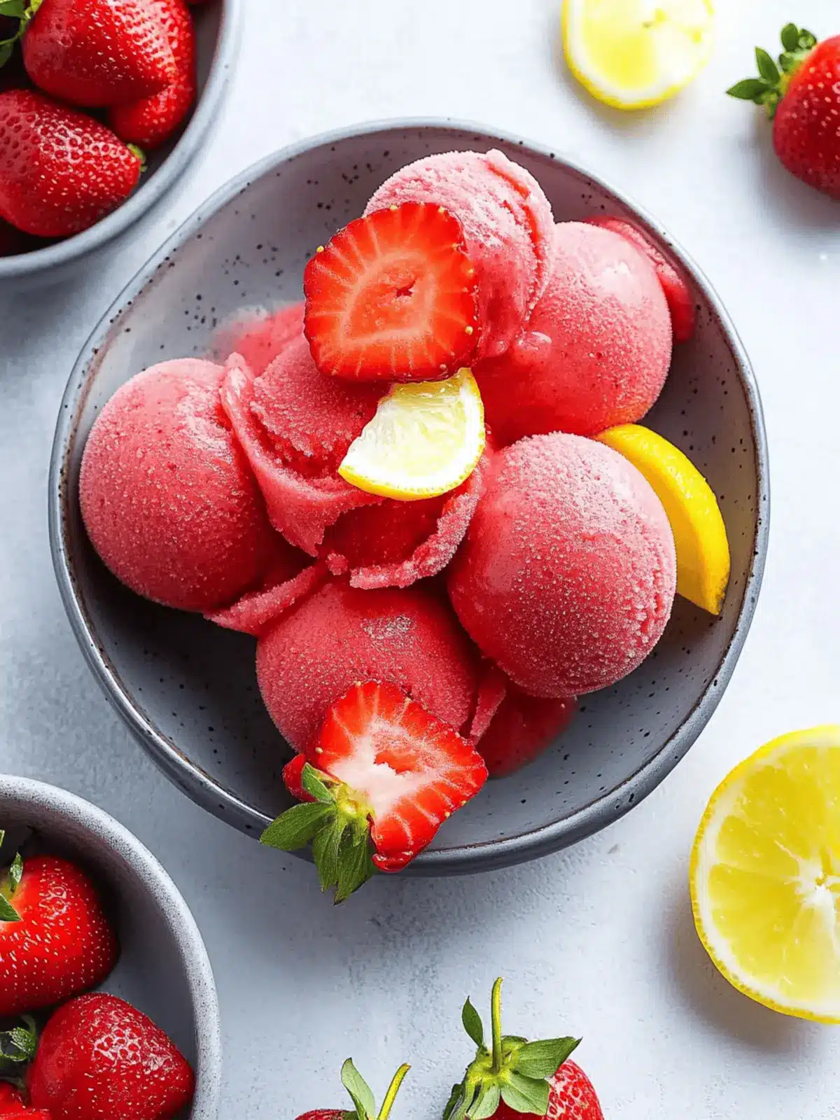 These Easy 4-Ingredient Strawberry Sorbet options are perfect for busy home cooks! You can prepare the strawberry mixture up to 24 hours in advance. Simply make the sugar syrup, allow it to cool, and blend it with the strawberries and lemon juice. Transfer this mixture to a freezer-safe container and freeze it overnight. To maintain its quality, ensure the container is tightly sealed to prevent ice crystals from forming. When you’re ready to serve, simply scoop the sorbet into bowls—it’s just as delicious and refreshing as if freshly made! This way, you can enjoy a delightful dessert without any last-minute fuss, making your summer moments even sweeter.